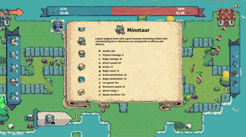 TinyWar is a fast-paced, real-time, auto-battler game, where players fight each other on a small map, with the sole goal of destroying the enemy base. A never-ending horde of units spawn from each base and walk down one of the three lanes. Players can queue up units to spawn, decide which lane(s) the units should take, select from a variety of boosts to help their units win the battle, and decide on an engagement strategy. Remember! If your base is destroyed, you lose the game.